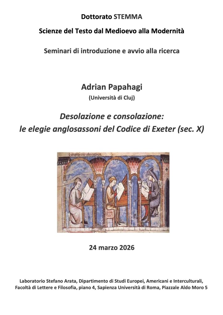As a member of the STEMMA doctoral school (Scienze del Testo dal Medioevo alla Modernità), Prof. Papahagi also lectured on the Old English elegies of the Exeter Book at the Sapienza, on 24 March. The lecture was entitled “Desolazione e consolazione: le elegie anglosassoni del Codice di Exeter (sec. X)”.